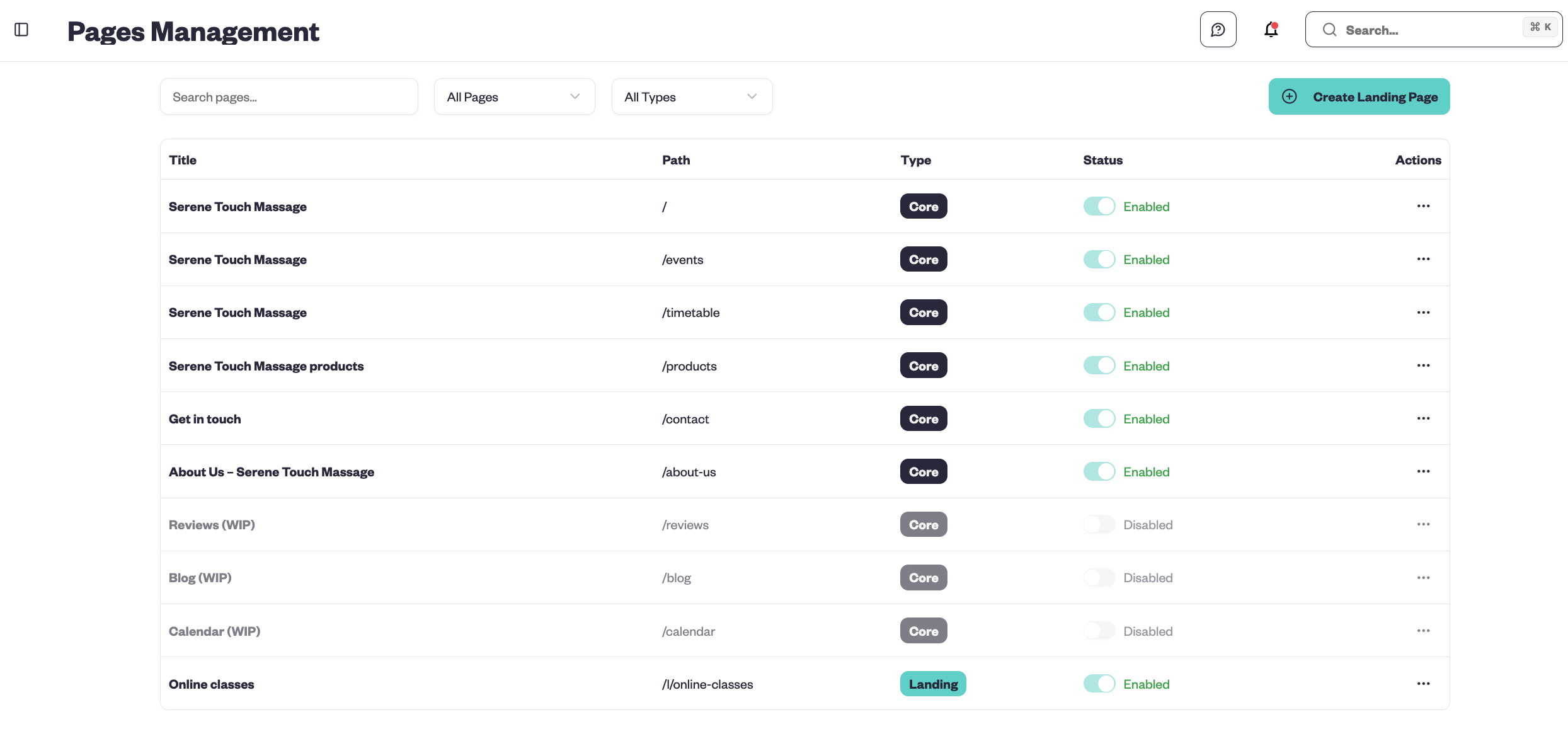 In the Pages Management section, you can manage and customise all your website pages. This includes your core pages like the Homepage, Events, Timetable, Products, Contact, and About Us. You can also create and edit additional pages such as Landing Pages, Blog, Calendar, Reviews, and more.