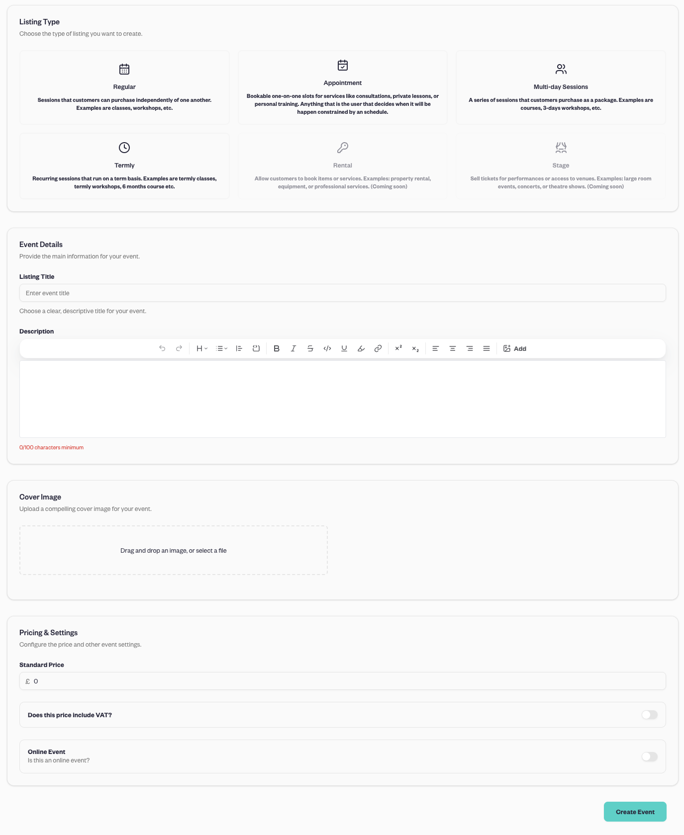 Once you’ve chosen the event type, you can add event title, description, image, price, and public keywords. Click “Create Event”.