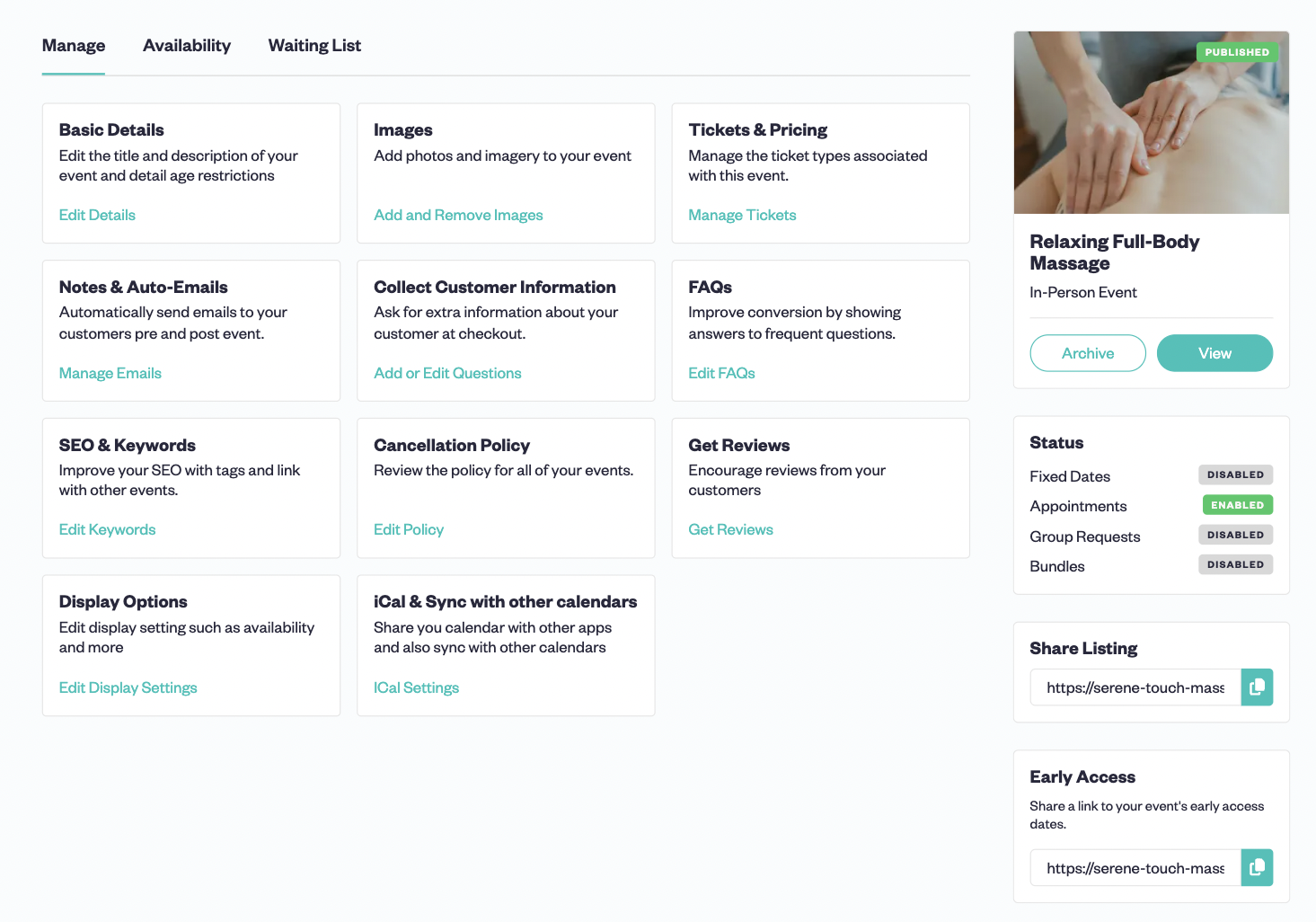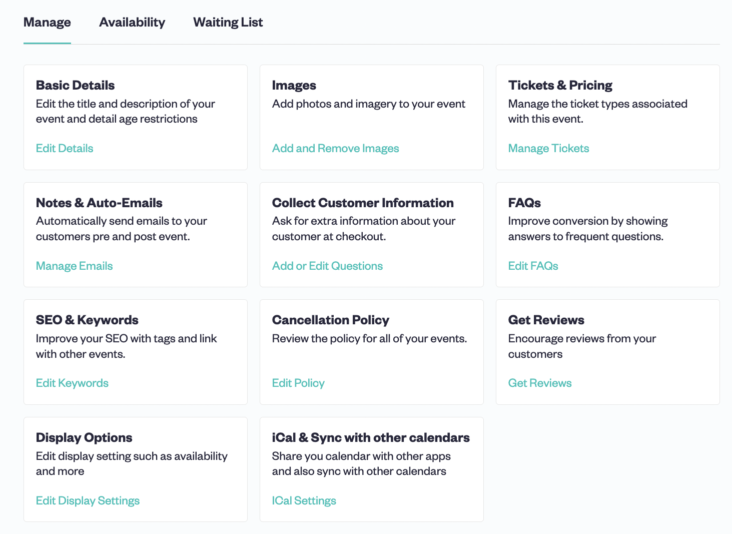 You can also explore a variety of customisable features — from uploading more images and adjusting ticket types and pricing, to creating questions for customers at checkout, adding or editing FAQs, and more.