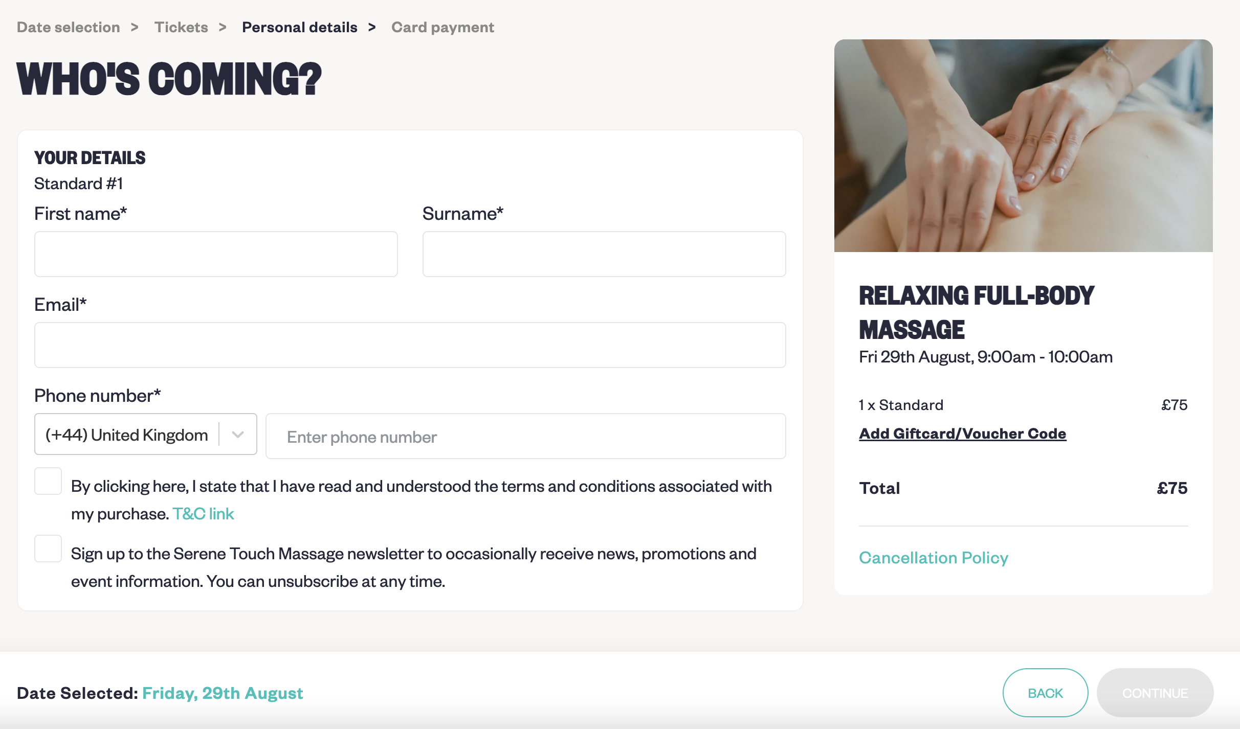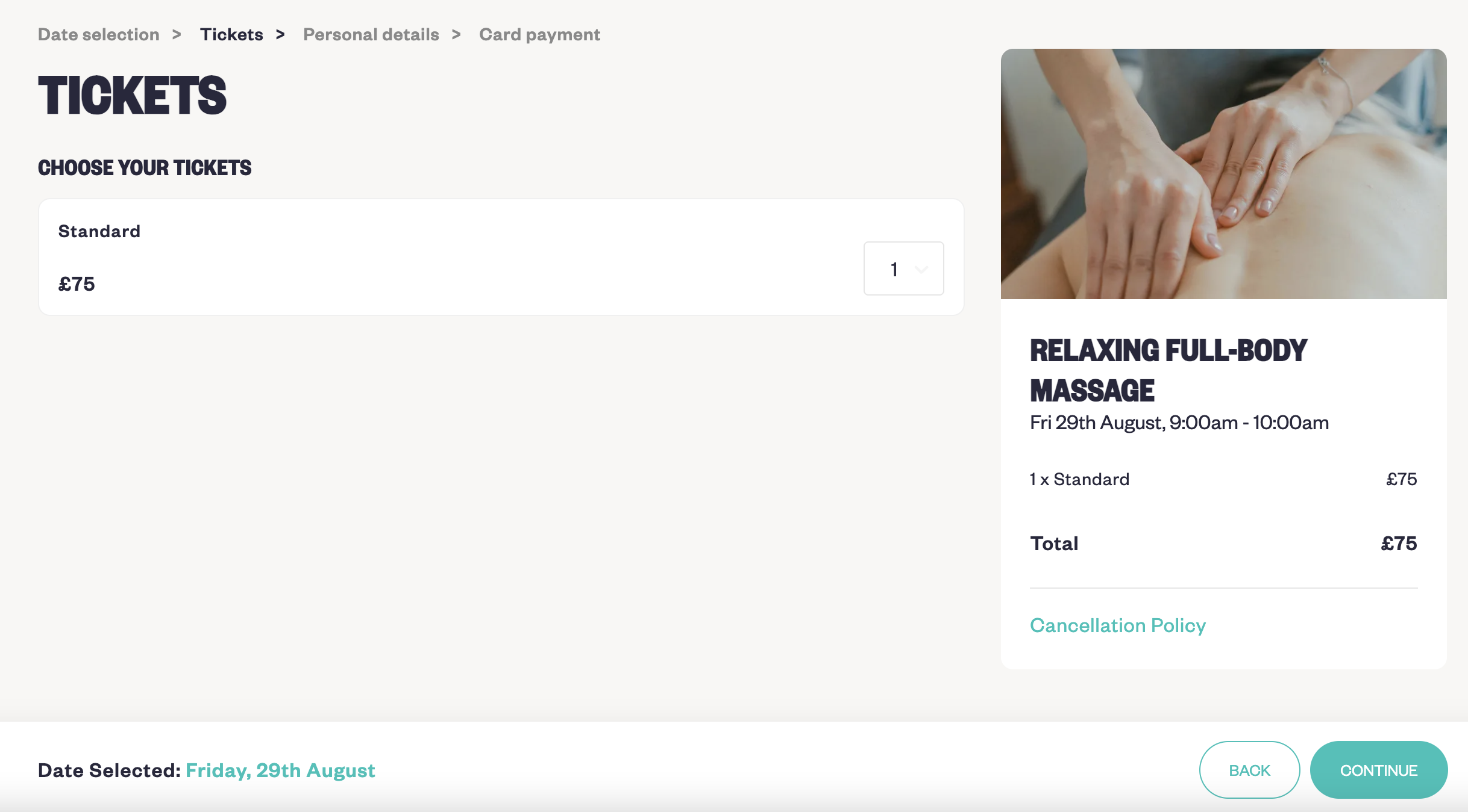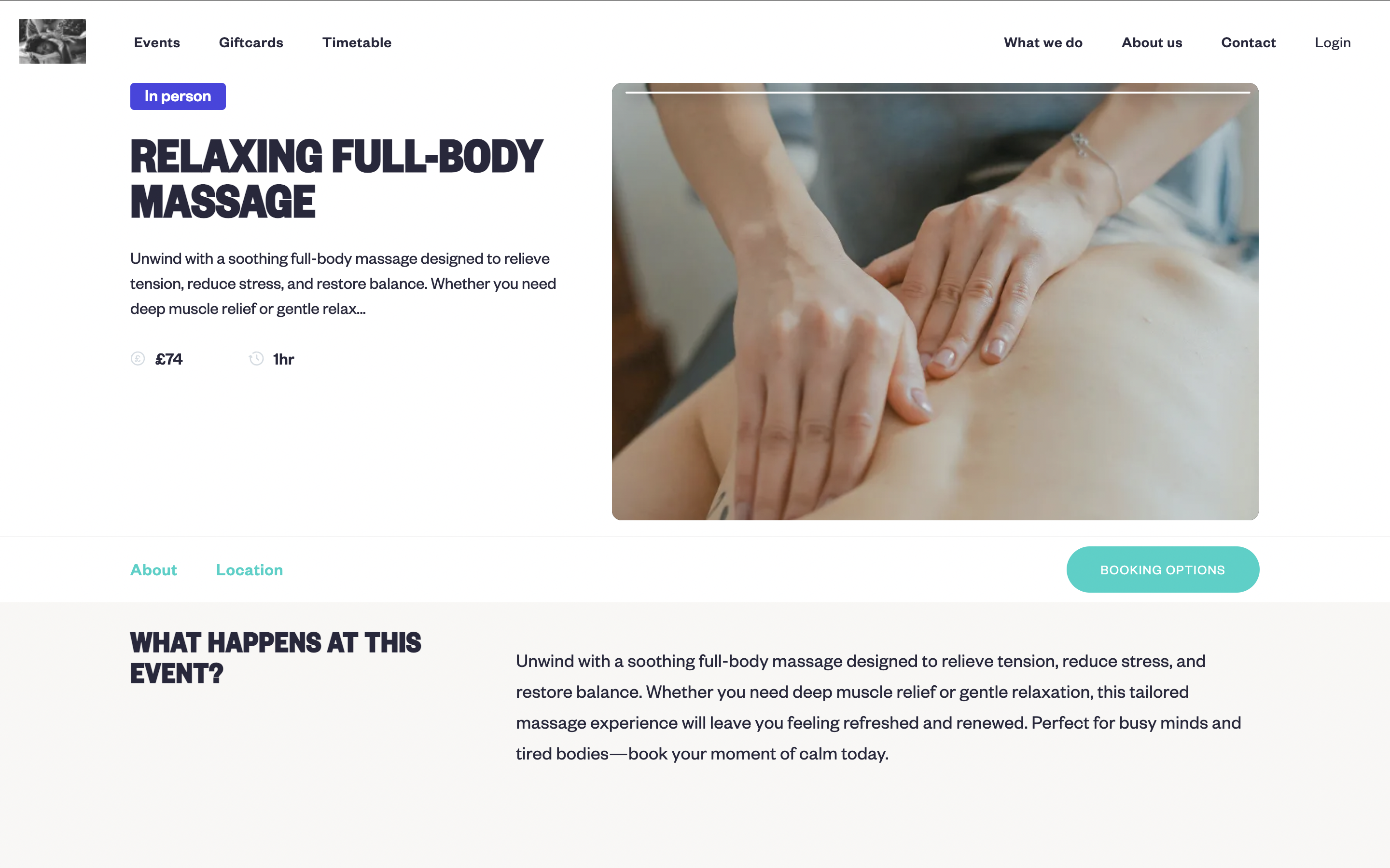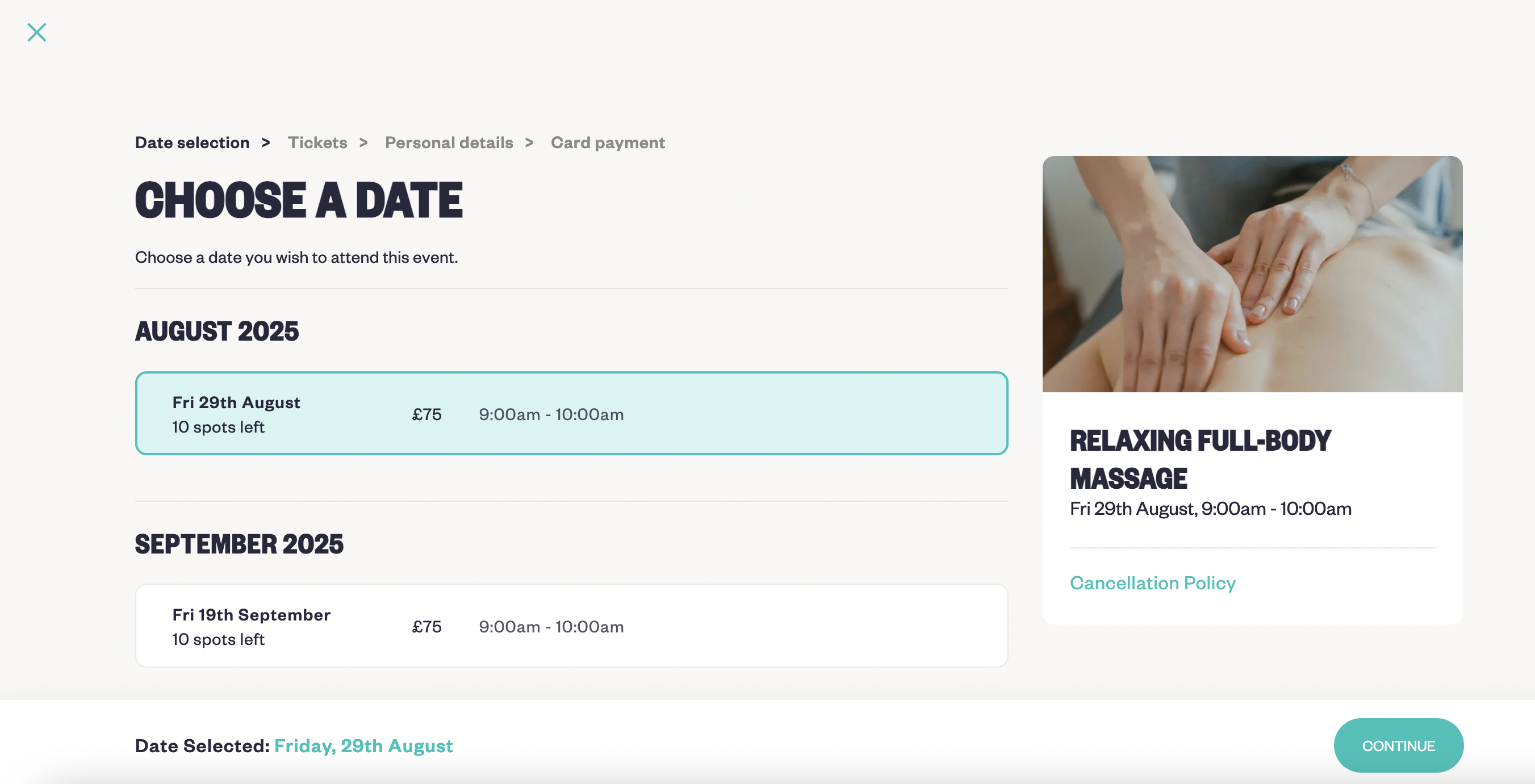 Once they’ve selected the event they want to book, your customers simply click Booking Options, choose a date, fill in their details, and pay.