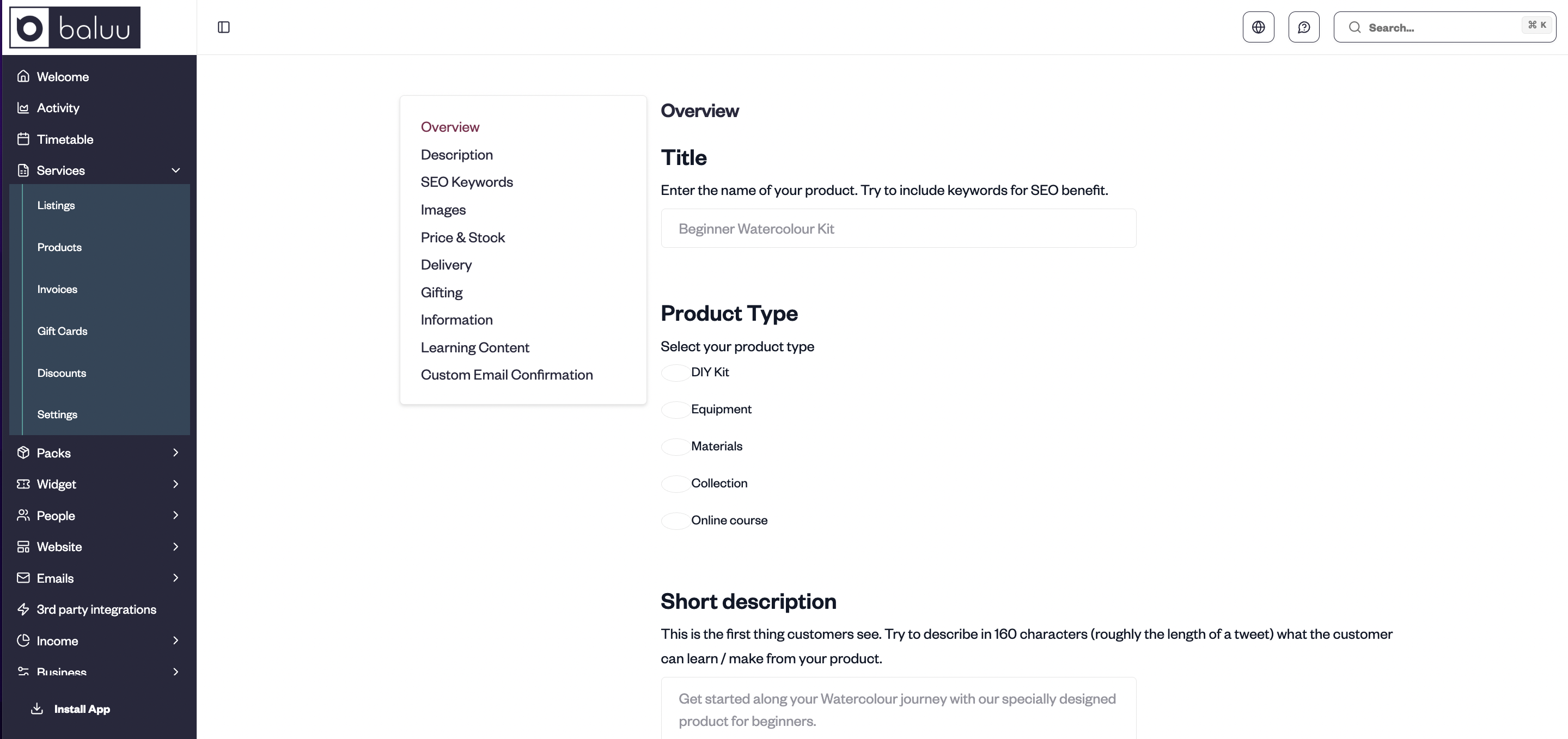 If you’d like to sell products, go to your dashboard, click on Services, and select Products. Here, you can add a new product by choosing a Product Type (such as DIY Kit, Equipment, Materials, Collection, or Online Course).