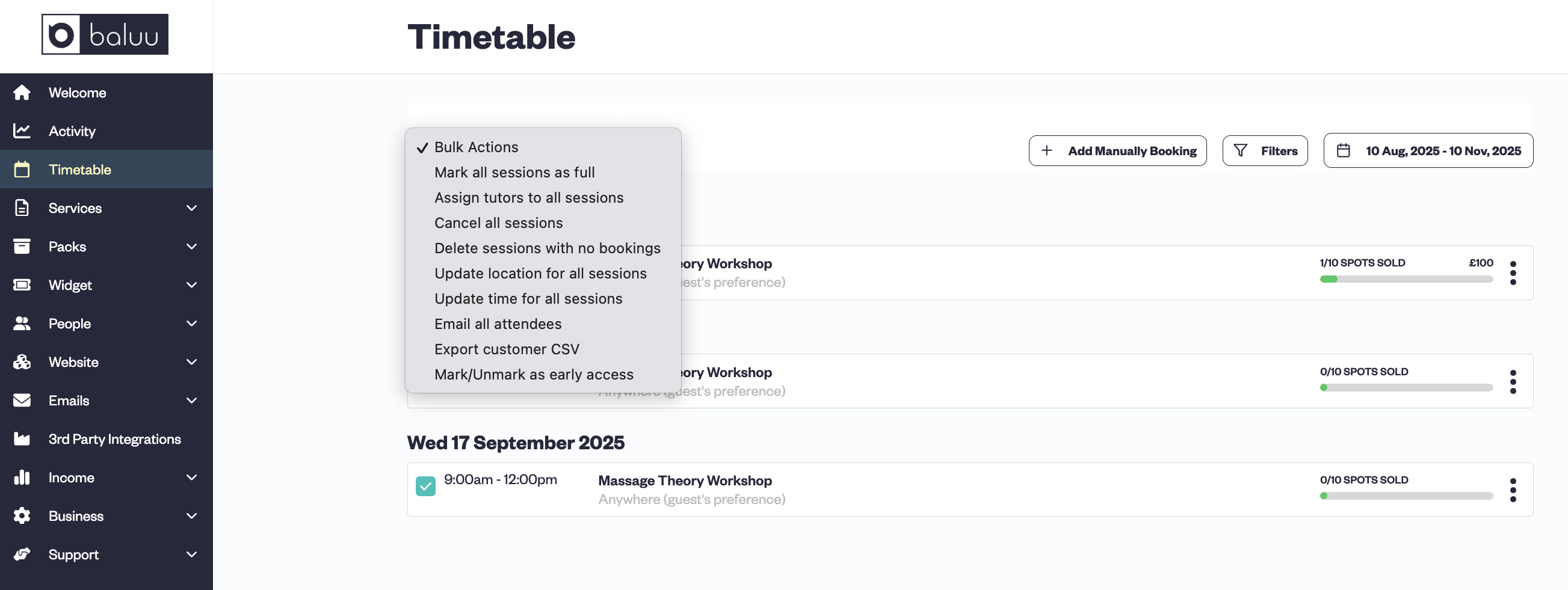 If you need to update or cancel a session, head to the Timetable page. There, the Bulk Changes tool allows you to quickly apply changes across multiple events and notify customers of any updates.