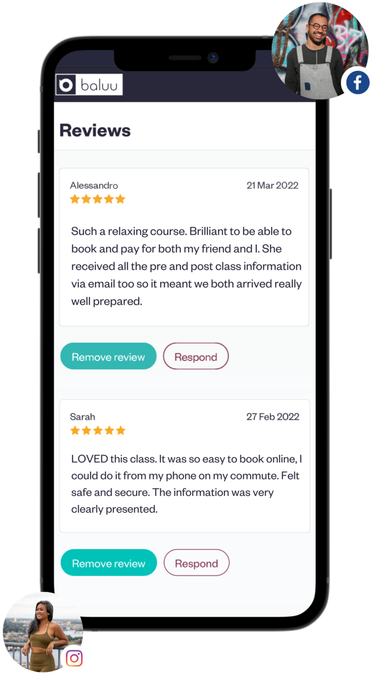 If you’re using Baluu, your customer feedback automatically appears on your Baluu website and class pages — creating instant social proof right where people decide to book. But you can also reuse those reviews across other marketing channels, from your own website and social media to paid ads and review sites.